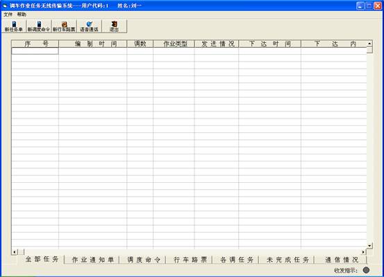 ?? 整個(gè)工作窗口的主體是一個(gè)作業(yè)任務(wù)表格,按照下達(dá)的時(shí)間順序自動(dòng)編號,它可以顯示每一條作業(yè)任務(wù)的序號、編制時(shí)間、對應(yīng)調(diào)數(shù)、任務(wù)類型、發(fā)送情況、下達(dá)時(shí)間、內(nèi)容等信息。