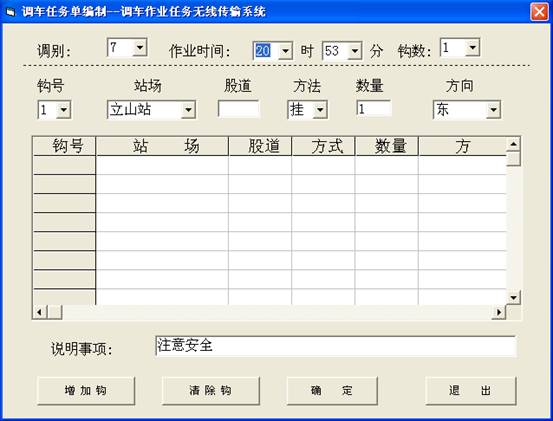 ??? 作業(yè)任務(wù)表格顯示本班調(diào)度的全部調(diào)車任務(wù),在交接班時(shí)自動(dòng)保存,新接班時(shí)表格為空,隨著增加新任務(wù),陸續(xù)添加。